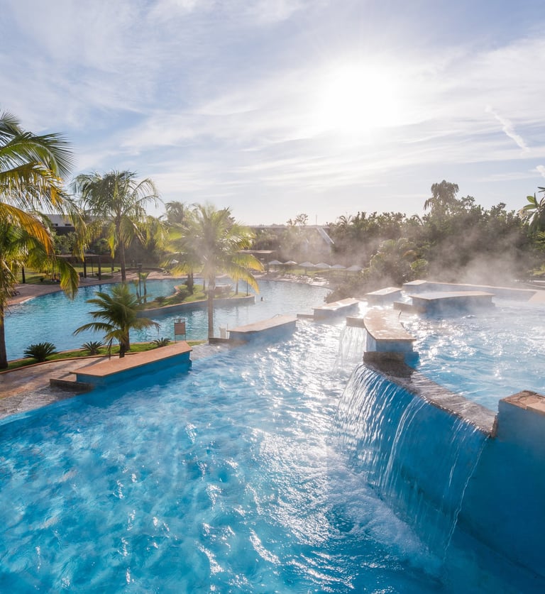 2.800 metros quadrados de piscinas com águas termais naturais, piscina infantil, toboáguas, sauna, salão de jogos, sala kids, quadras esportivas, spa completo e ateliê de beleza. Aproveite o melhor em lazer, entretenimento e relaxamento em um ambiente encantador e acessível para todos, com pensão completa.